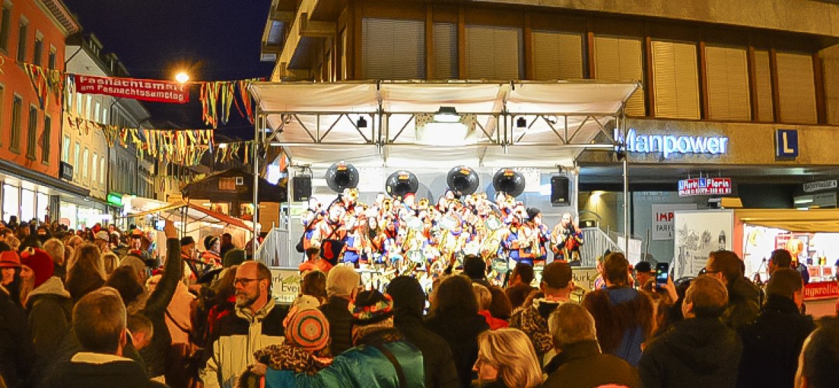 Guggenauftritte, Verpflegungsstände der Fasnachtsgruppen. Strassenfasnacht auf den Bühnen Schlossbergplatz, Cordulaplatz und Guggenbrunnen.