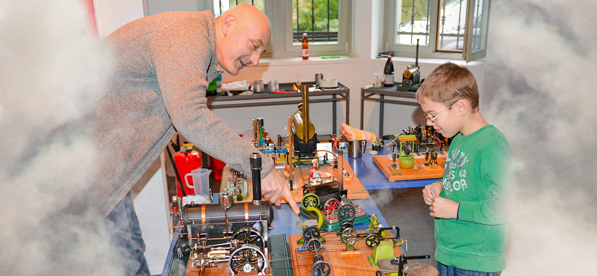 Technische Errungenschaften im Spielzeugformat, Demonstrationen mit Dampf, Feuer und Wasser.