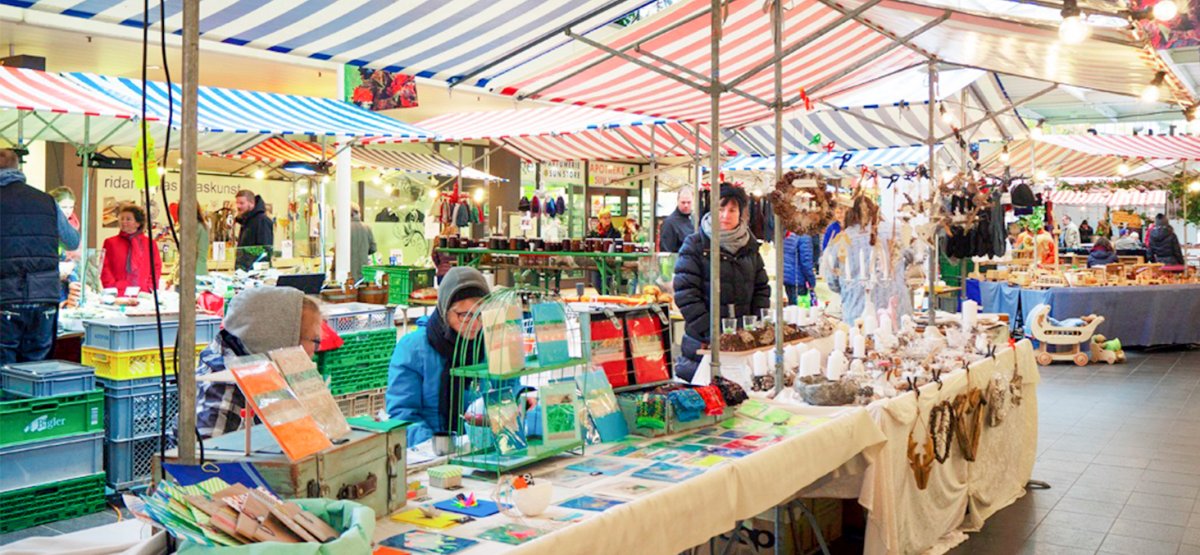 Stimmungsvoller Markt mit kulinarischen Spezialitäten und kreativem Kunsthandwerk. In der gedeckten Markthalle, mit Verpflegungsangebot.