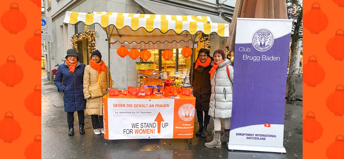 Orange ist die Farbe gegen Gewalt. Club-Mitglieder geben an ihrem Stand vor Moser’s Backparadies Informationen und orange Goodies.