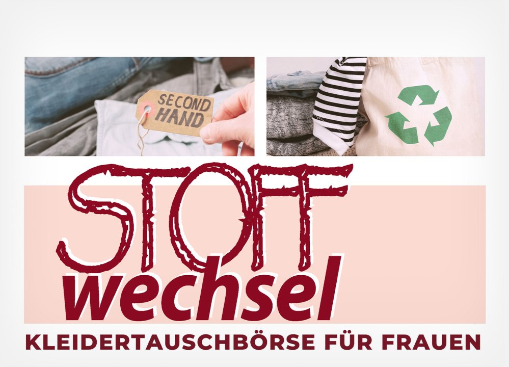 für Frauen von 16 bis 99 Jahren. Schrank ausmisten, vorbeikommen und so zu mehr Nachhaltigkeit beitragen! Neu: Entgegennahme der Artikel von 10 bis 13 Uhr, pro Person max. 15 Stück. Ohne Tauschartikel kostet ein Jeton einen Franken. Mehr Infos: