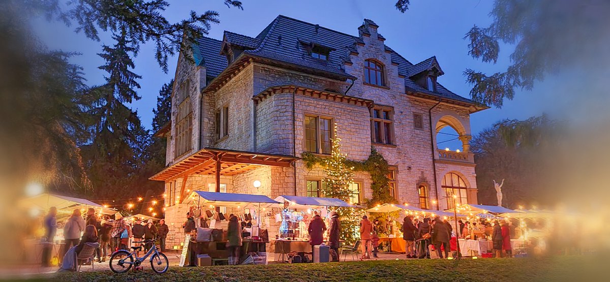 Ein Weihnachtsmarkt der besonderen Art: In wunderbarer Atmosphäre präsentieren die Anbieter:innen ihre selbst angefertigten Produkte vor der einmaligen Kulisse aus Haus und Park.